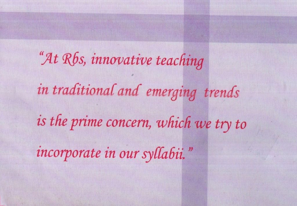 आर.बी.एस. इंस्टीटयूट ऑफ एजुकेशन प्रकृति की गोद मे सुरम्य वातावरण मे स्थित है, जो विद्यार्थियों को शहर के कोलाहल से दूर एकाग्र मन से शिक्षण एवं अधिगम के प्रति प्रेरित एवं प्रोत्साहित करता है। 14 वर्षो के समय मे हमारी उपलब्धियाॅं अकल्पनीय है तथा पूरे मालवा अंचल मे सबसे तेजी से उभरता हुआ शिक्षण संस्थान बना है।